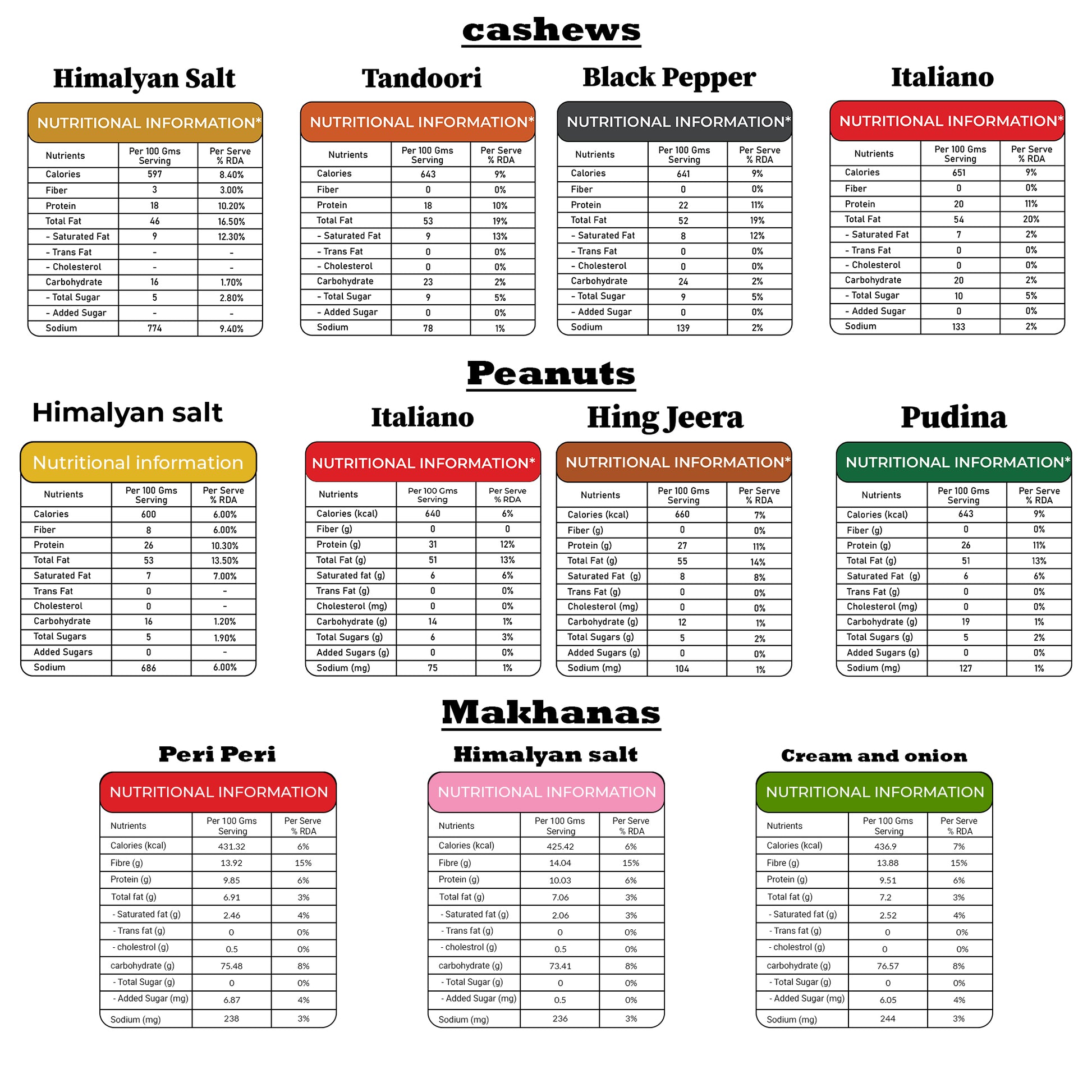 • Pack Sizes – Makhana 79g, Cashews 50g, Peanuts 75g
