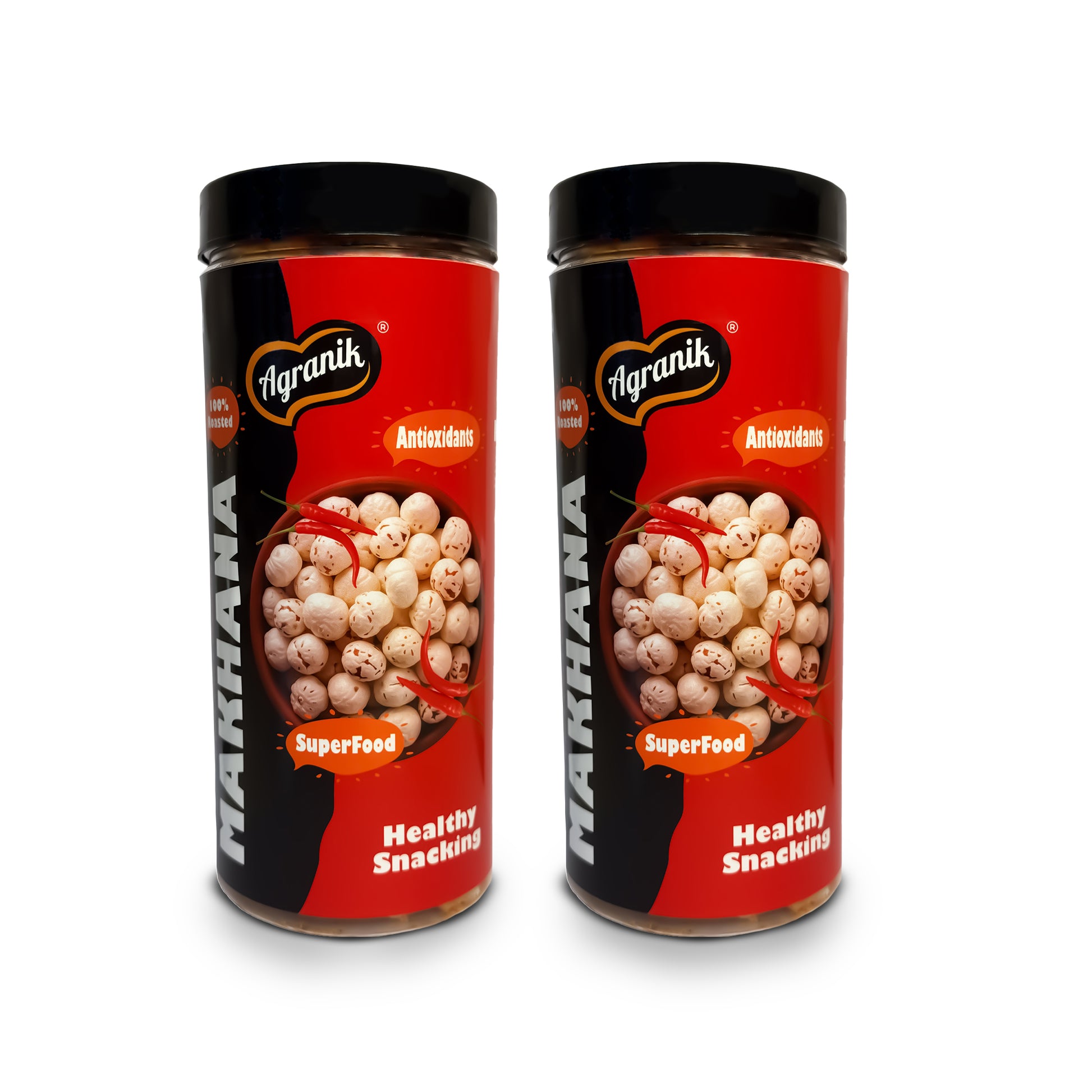 Agranik Peri Peri Roasted Makhana Combo. Made from premium quality fox nuts, this crunchy snack is roasted in heart-friendly olive oil and coated with bold peri peri seasoning for a deliciously tangy and spicy flavor. Naturally high in plant-based protein and extremely low in calories, makhana is an excellent choice for weight watchers, fitness lovers, and anyone seeking a guilt-free snack option.