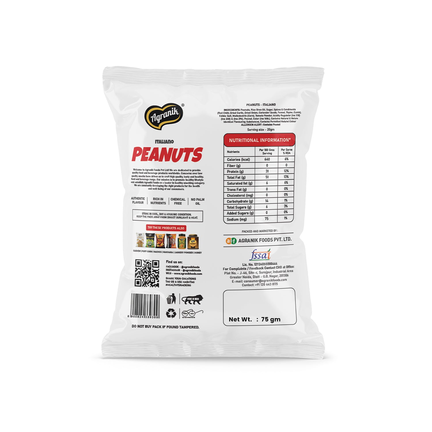 Enjoy a Mediterranean twist on healthy snacking with Agranik Italiano Flavoured Roasted Peanuts. Made from premium quality peanuts and slow-roasted in heart-friendly olive oil, these crunchy delights deliver an authentic Italiano seasoning that adds rich, savory flavour to every bite. Free from palm oil, artificial preservatives, and unnecessary additives, they offer a clean and wholesome alternative to fried and processed snacks.