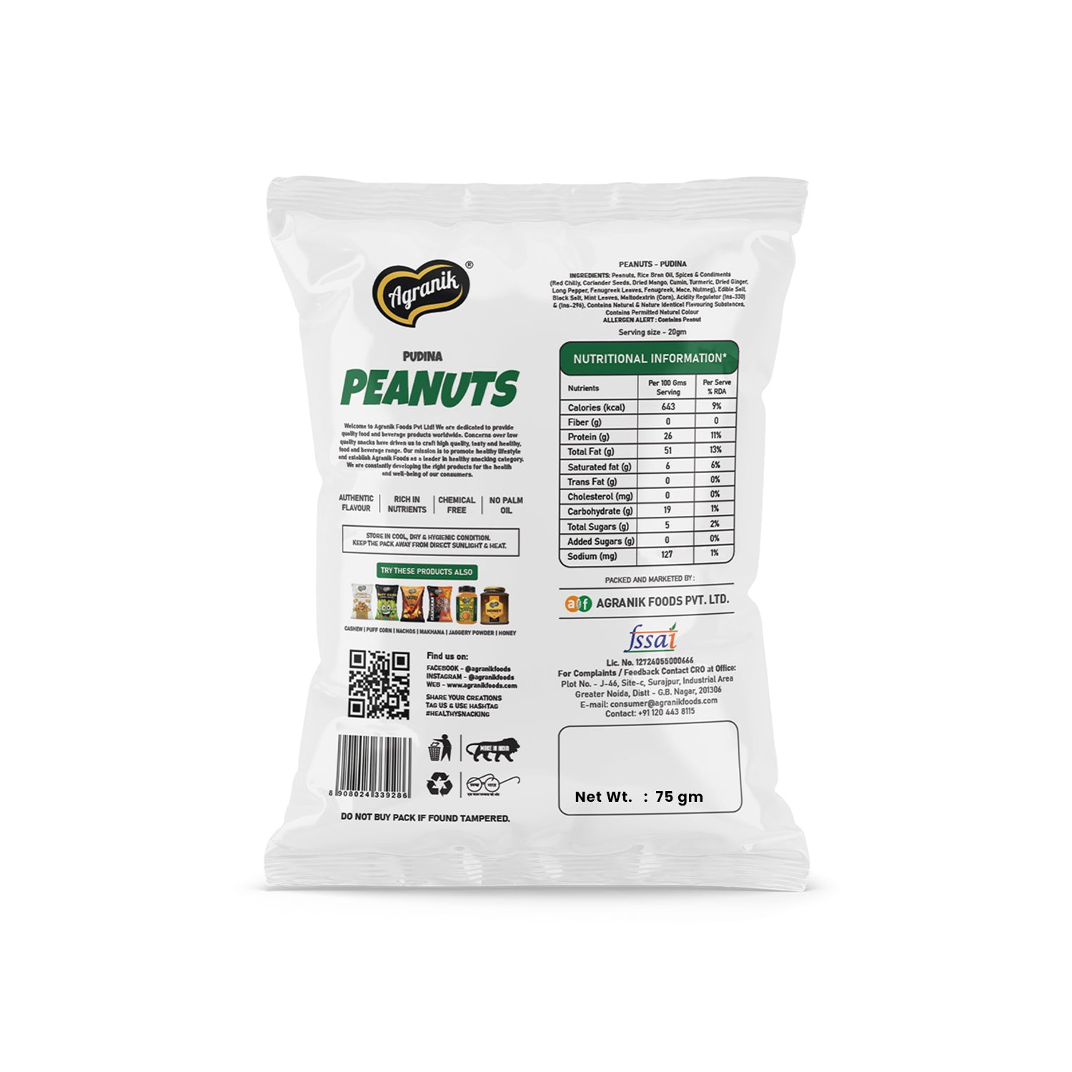 Naturally rich in plant-based protein, fiber, and essential nutrients, Agranik roasted peanuts provide sustained energy, support muscle recovery, and keep you fuller for longer. Ideal for office snacking, travel packs, post-workout munching, or evening cravings, they fit effortlessly into active and health-conscious lifestyles. Hygienically packed to retain freshness and flavour, Agranik Pudina Peanuts deliver the perfect balance of crunch, refreshment, and nutrition in every handful.