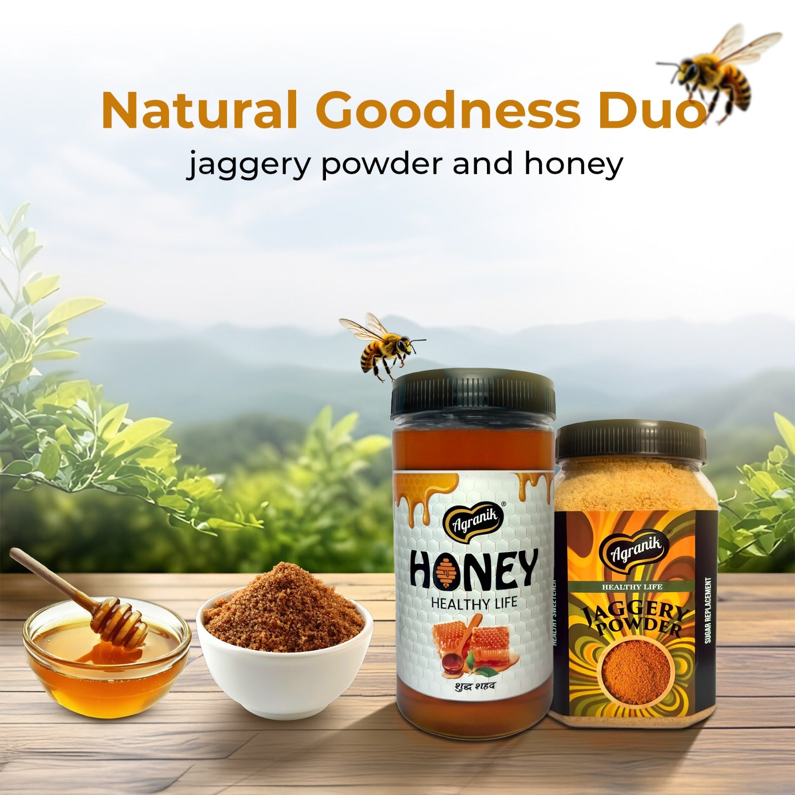 Agranik Sweetener Dual Combo Pure Jaggery Powder + Himalayan Honey | Goodness of Natural Sweeteners, 100% Chemical Free and Naturally Processed (700G Jaggery Powder + 450G Honey)